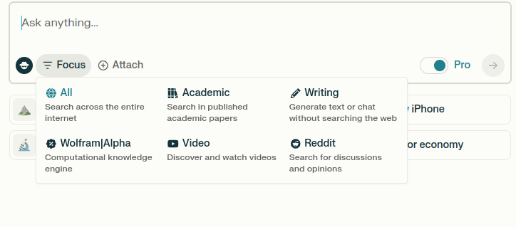 Функция фокусировки позволяет пользователям указывать контекст или область поиска для своих поисковых запросов. Выбрав определённую фокусировку, пользователи могут сузить результаты поиска, чтобы они соответствовали их конкретным потребностям, будь то академические исследования, создание контента или любая другая специализированная задача.
