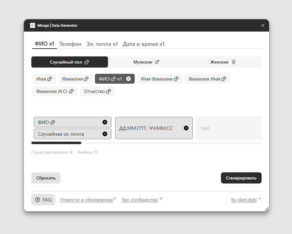 ФИО — полное ФИО, фамилия и инициалы, фамилия + имя, имя + фамилия, только фамилия или только имя, отчество. Поддерживается выбор мужского, женского или случайного гендера;