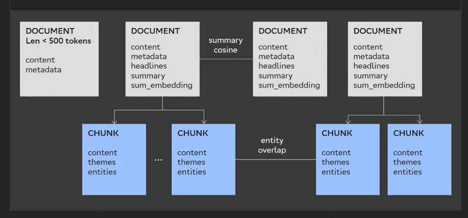 Шаг четыре: когда мы уже отсекли ненужный элемент — берем embedding от summary документов, извлекаем темы, извлекаем сущности, строим связь по косинусу эмбеддингов от summary, а затем строим связь по перекрытию сущностей для чанков.