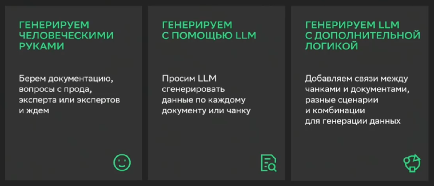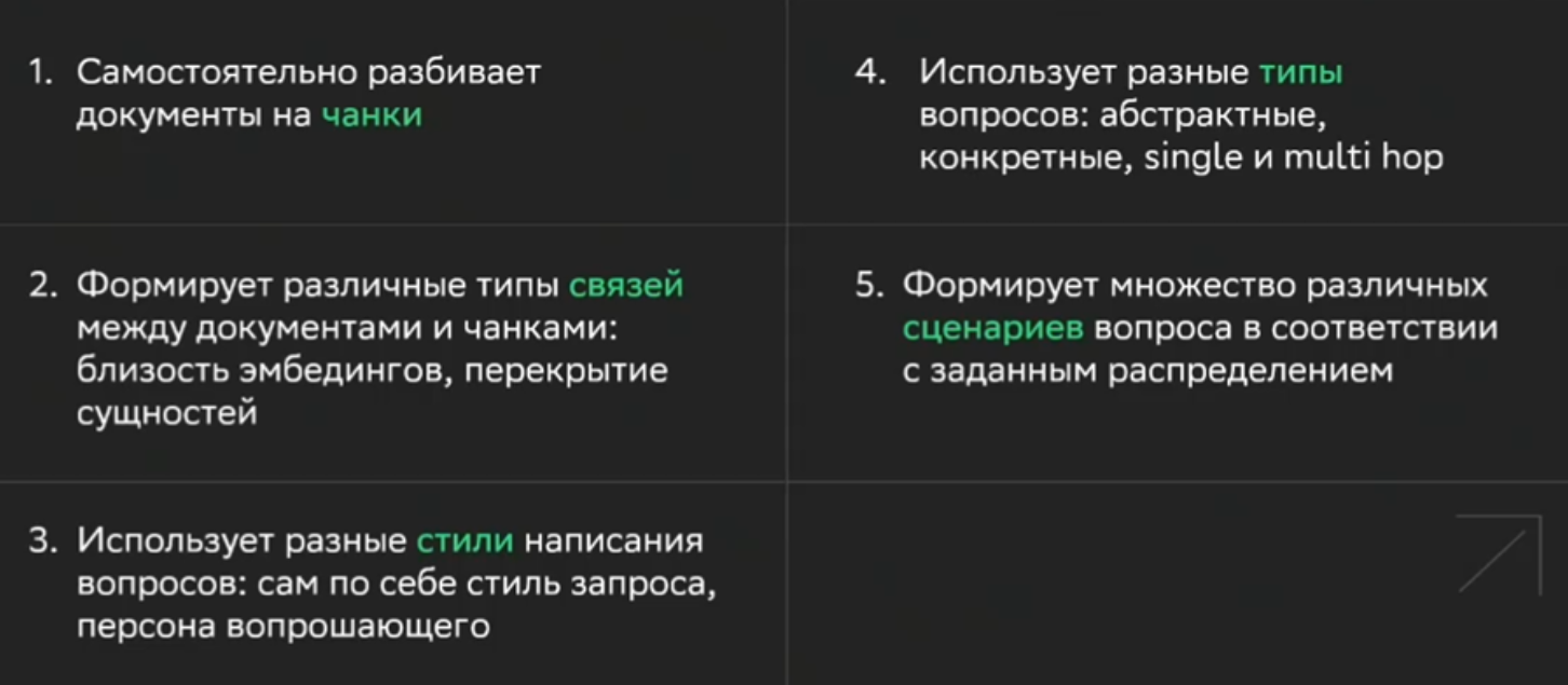 - генерировать синтетические тестовые данные (вопросы и ответы) на основе документации.