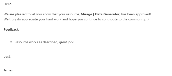 Не обошлось без небольших сложностей. На этапе оформления описания Figma выдала уникальный ID, который нужно вставить в код. Он неожиданно поломал работу плагина. Я узнал об этом, когда пришло письмо от куратора с просьбой прислать деморолик с работой плагина. При попытке записать ролик выяснилось, что перестали генерироваться данные. Мой разработчик быстро исправил ошибку, и плагин заработал корректно. Я снял деморолик и отправил его ответным письмом, упомянув о том, что пришлось править код. На следующий день куратор прислал ещё одно письмо с замечанием, что плагин ломается именно на этапе генерации данных. Я понял свою ошибку — хотя код был исправлен локально, обновлённая версия плагина не была загружена в сообщество. На следующий день после обновления плагина, пришло письмо о том, что проверка пройдена успешно и плагин опубликован.