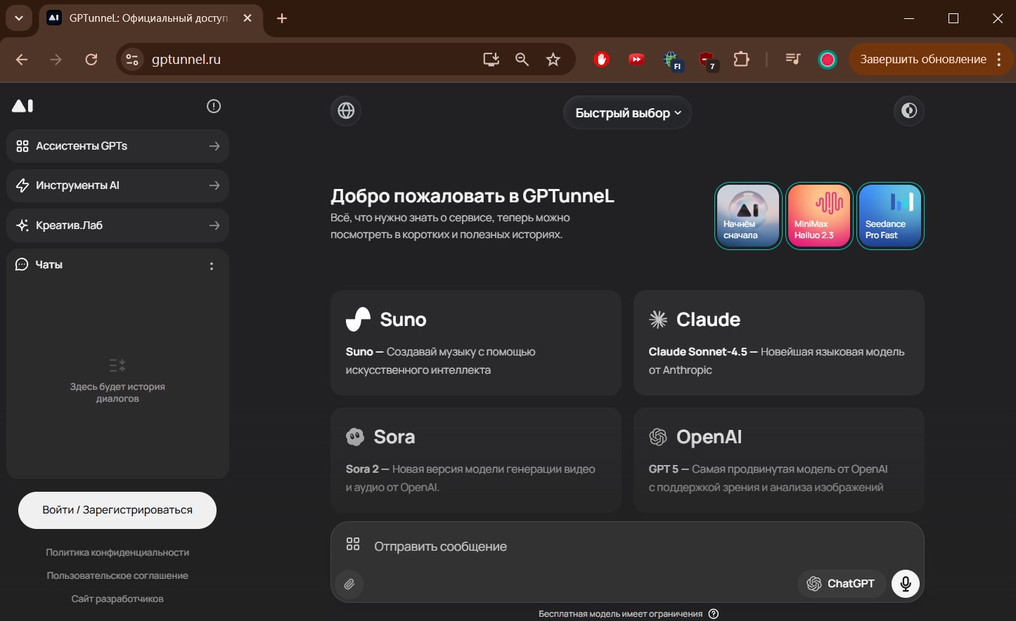 Для универсальности, когда требуется все - от видео до кода, - можно выбрать GPTunnel: более 100 моделей, от 450 рублей пополнения, с русскоязычным интерфейсом и гибкой оплатой.