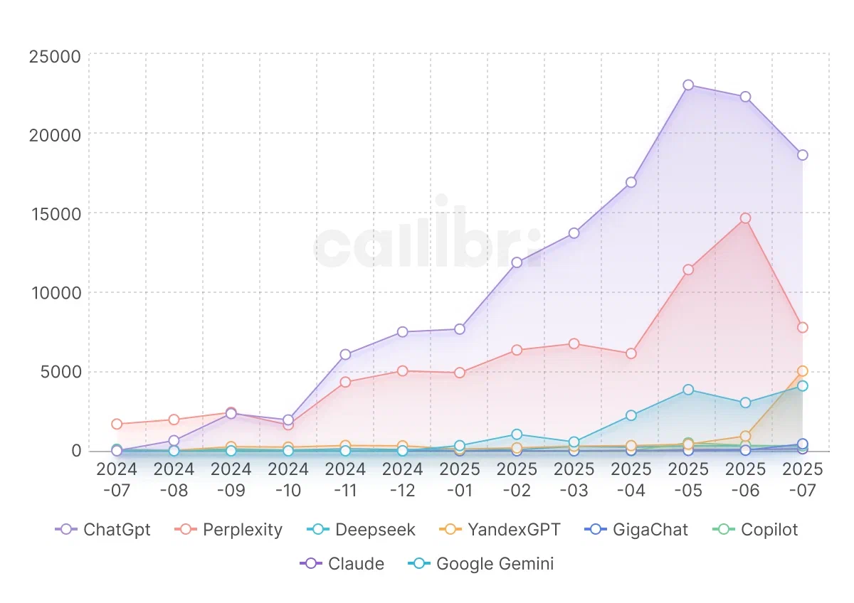 Есть свежие данные от Callibri: из всего множества заявок около 10% конверсий уже приходится на трафик из нейросетей. И это без учёта того, что трафик из Google Overview и «Яндекс.Нейро» мы вообще не можем отделить — он маркируется как обычный поисковый.