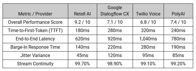 Платформы вроде Retell AI отвечают за 620 мс, в то время как другие, такие как Google Dialogflow CX и Twilio, часто превышают 900–1000 мс, что полностью меняет ощущение «человечности» взаимодействия.