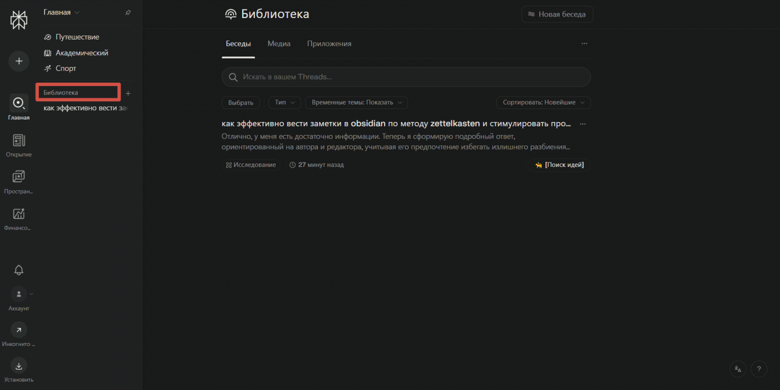 В разное время могут появляться разные идеи для изысканий, найти что-то из прежних результатов поиска можно во вкладке «Библиотека» и добавлять отдельные чаты в закладки. Отдельные пространства для хранения информации, помогут не запутаться в истории диалогов и сразу систематизировать данные, которые в дальнейшем пригодятся при написании текстов.