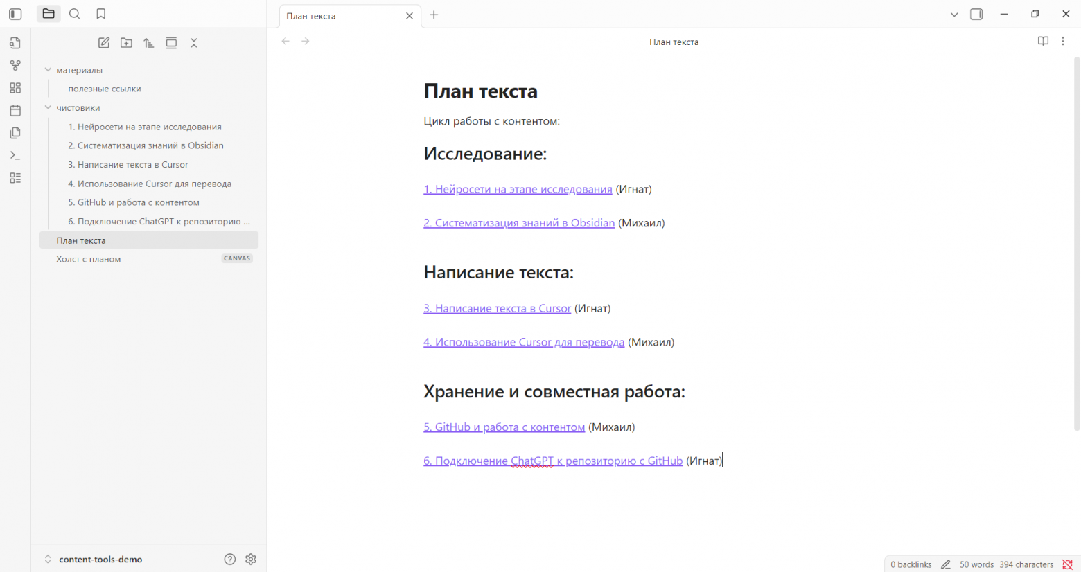 Обращаем ваше внимание, что это не «единственно правильная» цепочка инструментов, а наш рабочий процесс, который мы не только описали, но и усовершенствовали во время создания этой статьи. При иных обстоятельствах какие-то звенья могут отличаться: вместо Obsidian — какая-то другая система заметок и черновиков, вместо Cursor — хотя бы стандартный блокнот.