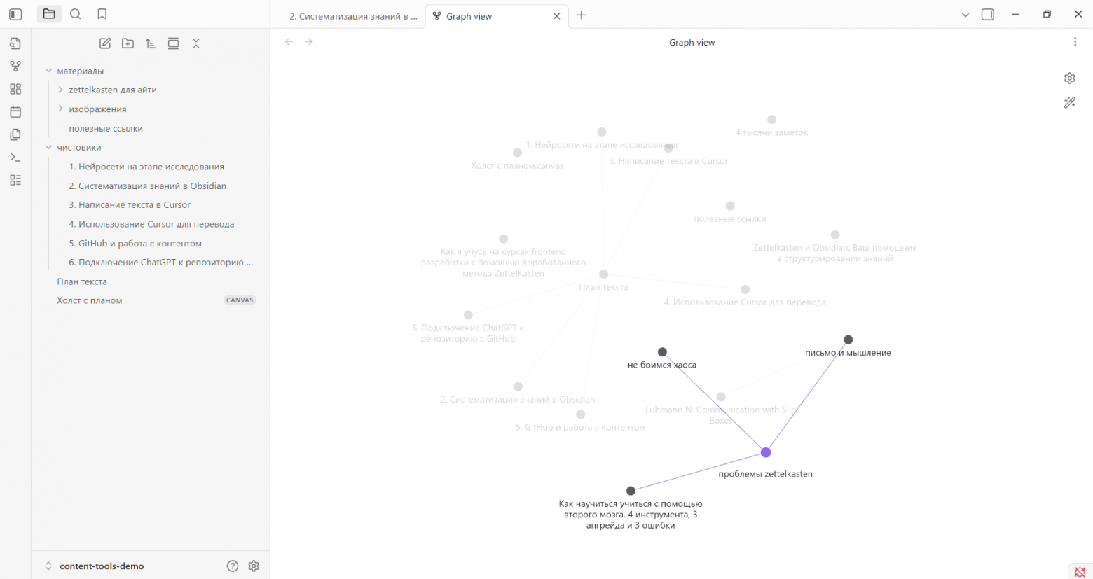Итак, мы начали поиск данных, и Perplexity подсказала нам источники. Но когда пишется большой текст, особенно если он не первый, в собранных материалах легко можно заблудиться. Здесь нам приходит на помощь Obsidian.