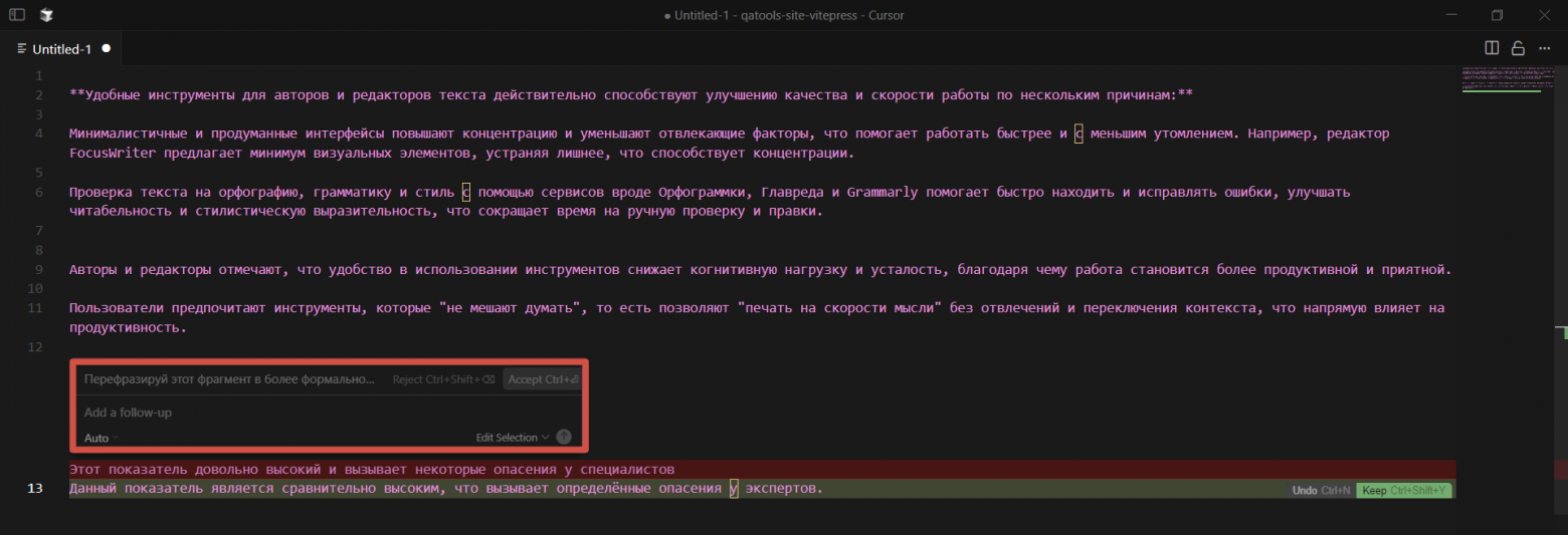 Написание текста с редактурой через ИИ-помощника в Cursor;