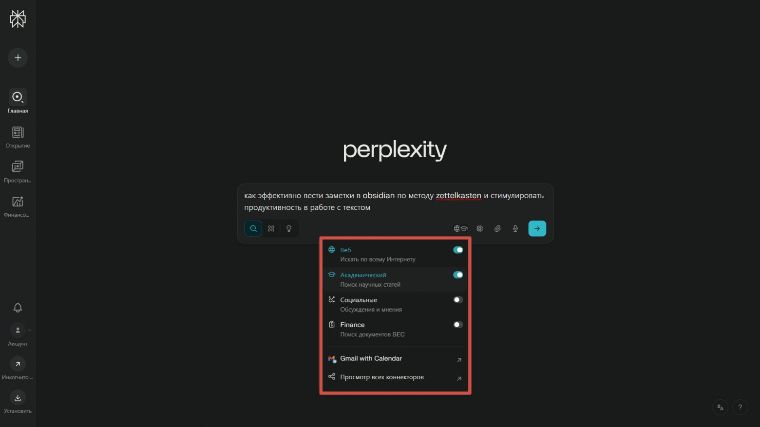 Перед тем как отправить запрос, можно указать типы источников — веб, академические, социальные или финансовые — и комбинировать их для более глубокого и полноценного изучения. Так получается быстрее охватить сразу несколько специализированных аспектов темы, чем традиционным образом гуглить все интересующие вещи по отдельности.