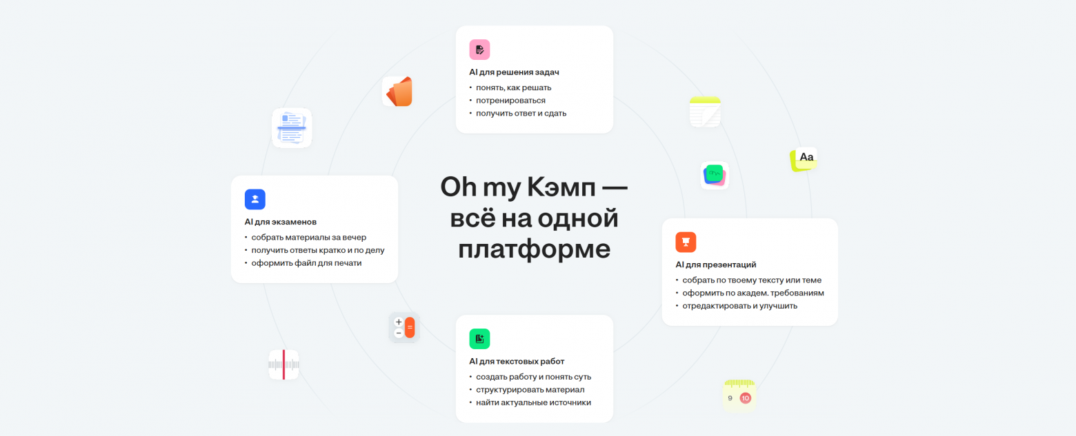 Учеба в институте требует работы с большими объемами информации. Кэмп выступает как нейросеть для помощи студентам на всех этапах: