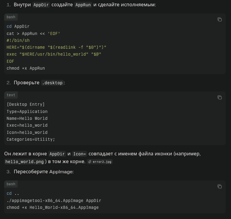 Тут я опять выбрал ответ от Perplexity так как он подсказал создать файл AppRun, который необходим для запуска приложения.