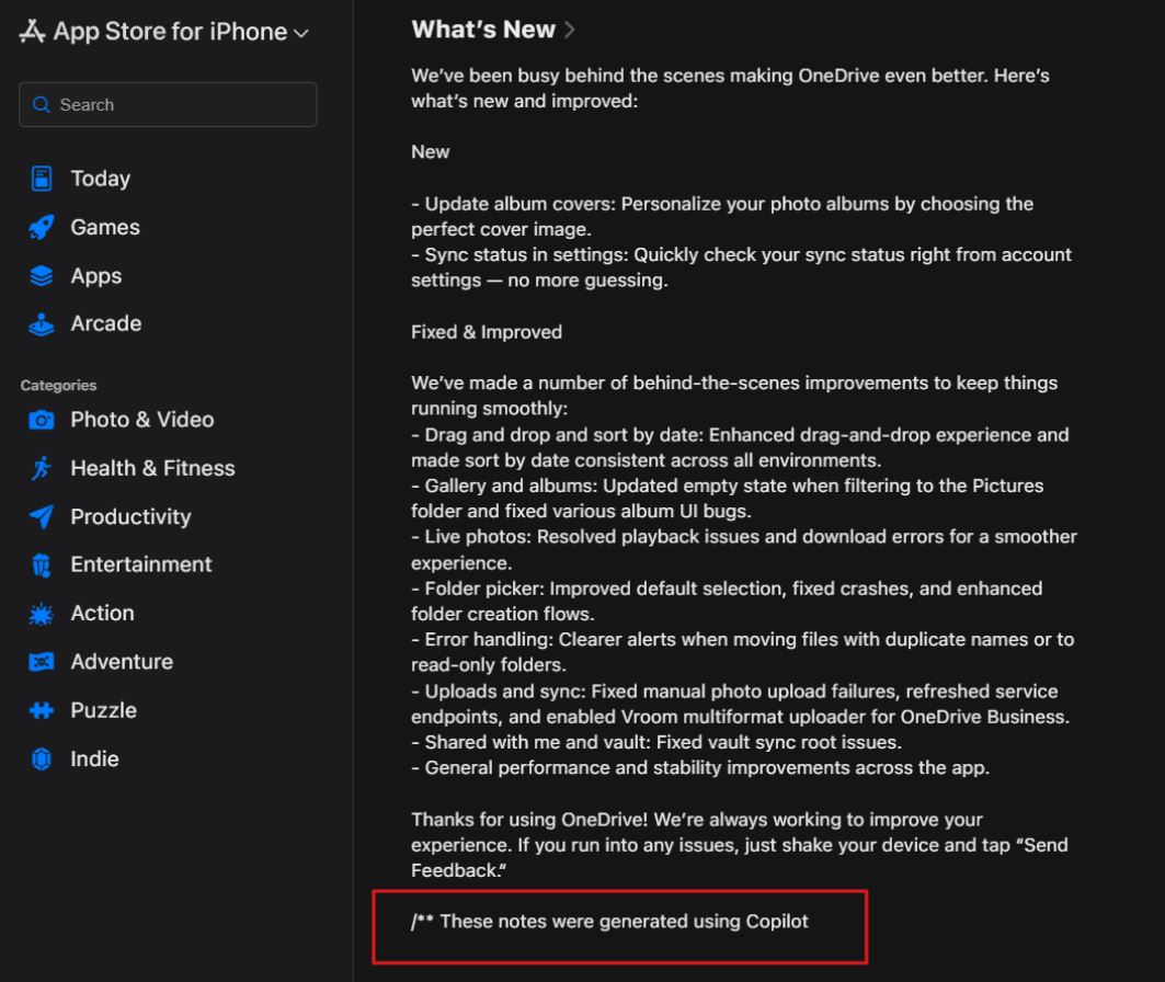 Microsoft добавляет такие примечания с 13 мая 2025 года. Однако ранее пометки были не видны в истории версий большинства приложений компании в App Store. Кроме того, в журнале изменений приложения OneDrive для Mac нет упоминания о том, что оно сгенерировано с помощью Copilot. В Android-смартфонах Play Store вообще не отображается история версий.