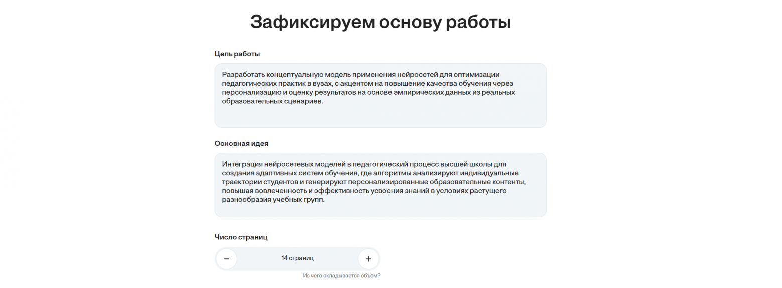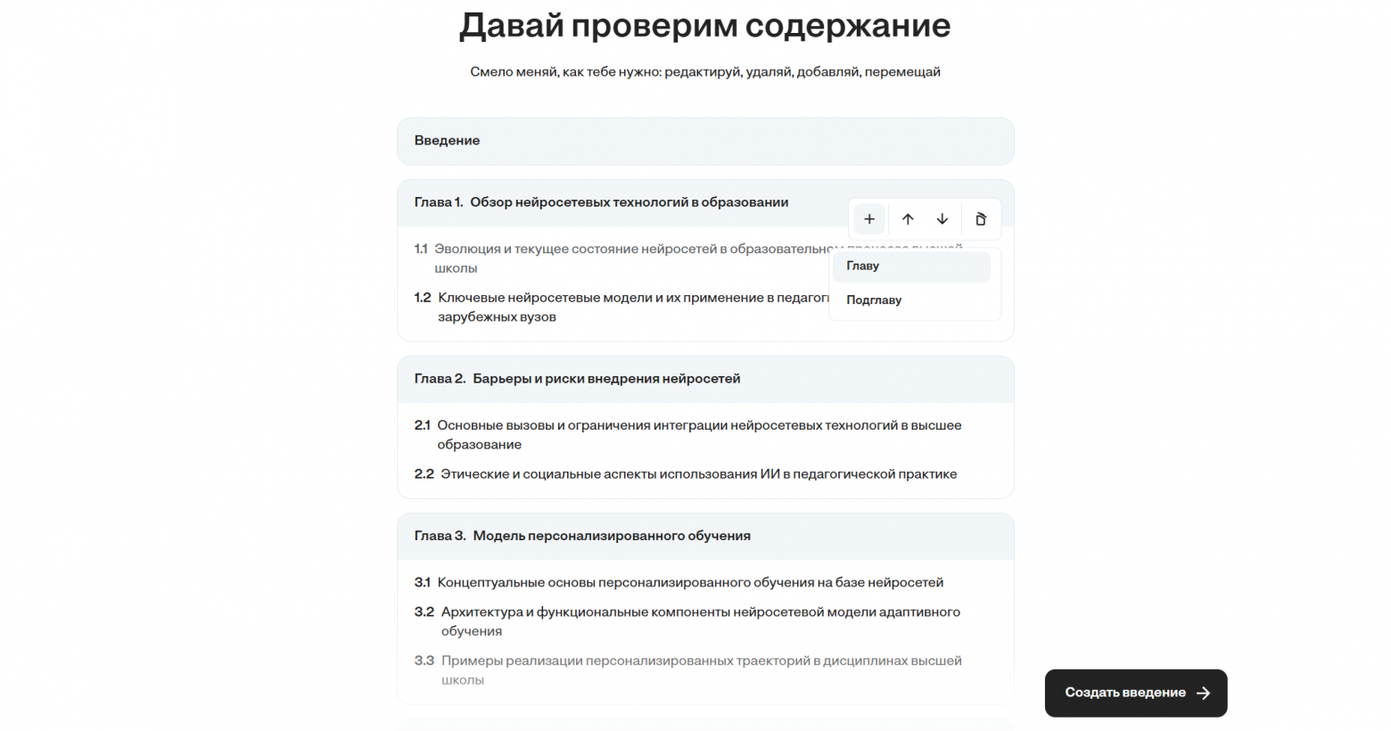 Действие пользователя: На этом этапе вы выступаете как научный руководитель. Внимательно просмотрите предложенные пункты. Если нейросеть упустила важный аспект, добавьте подзаголовок вручную или отредактируйте предложенные. Это обеспечит логическую цельность будущего текста.