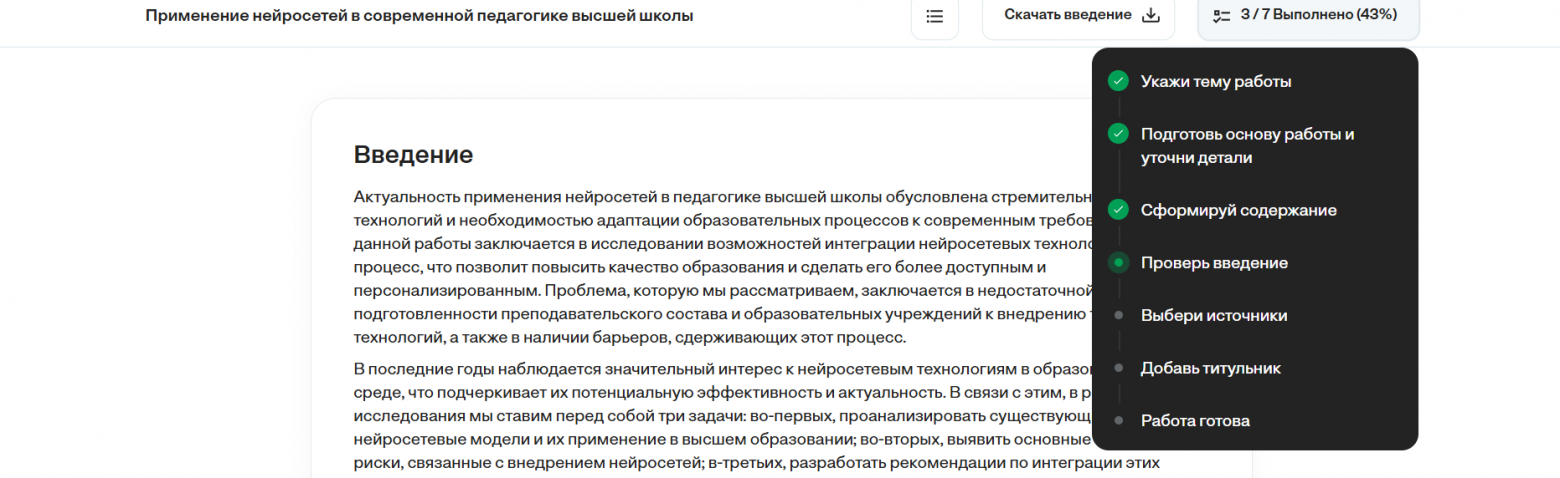Глубокая генерация по структуре: Сервис не выдает сплошную «простыню» текста. Он разбивает работу на логические блоки (введение, главы, заключение), что критически важно для написания НИР (научно-исследовательских работ).