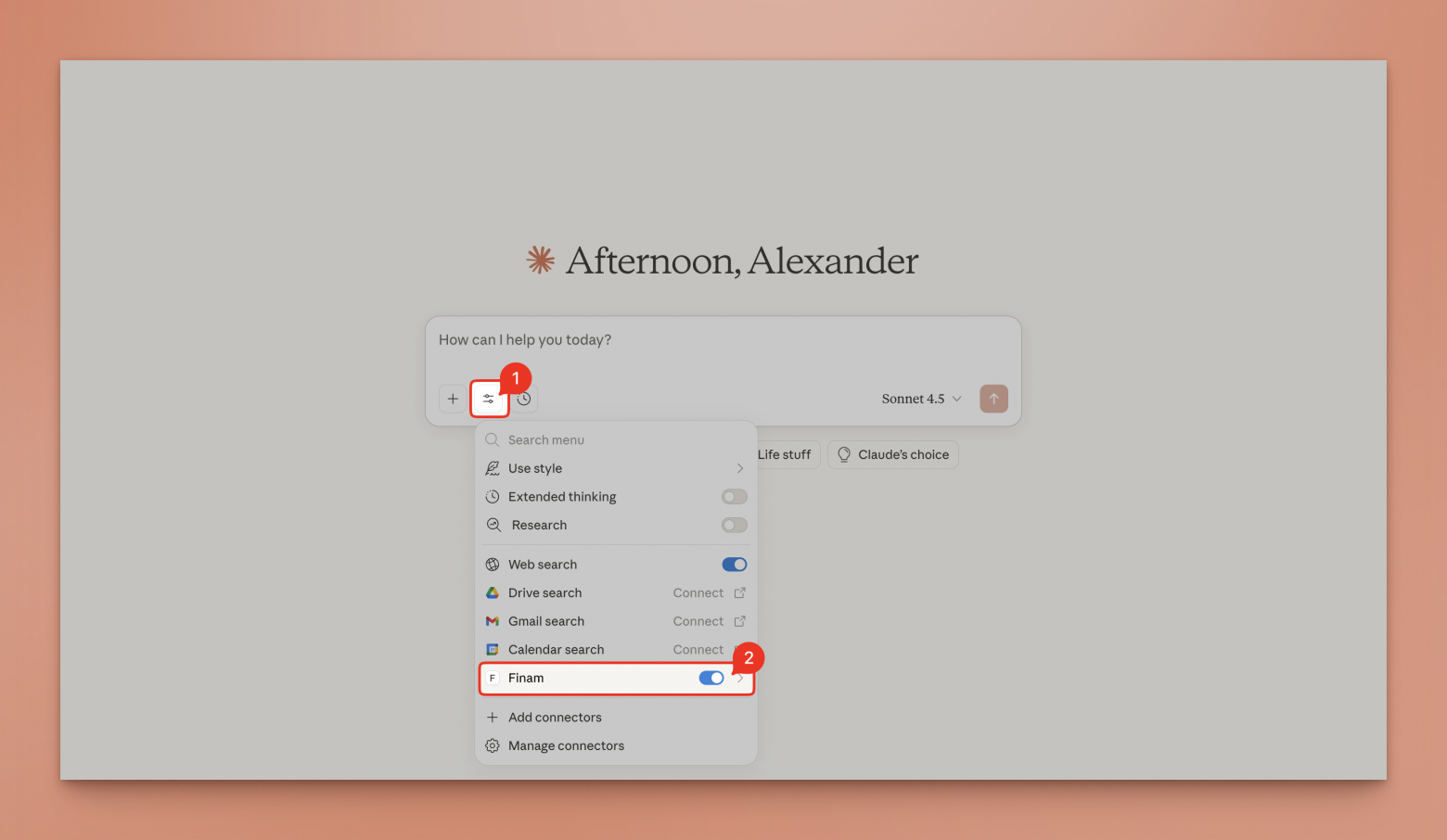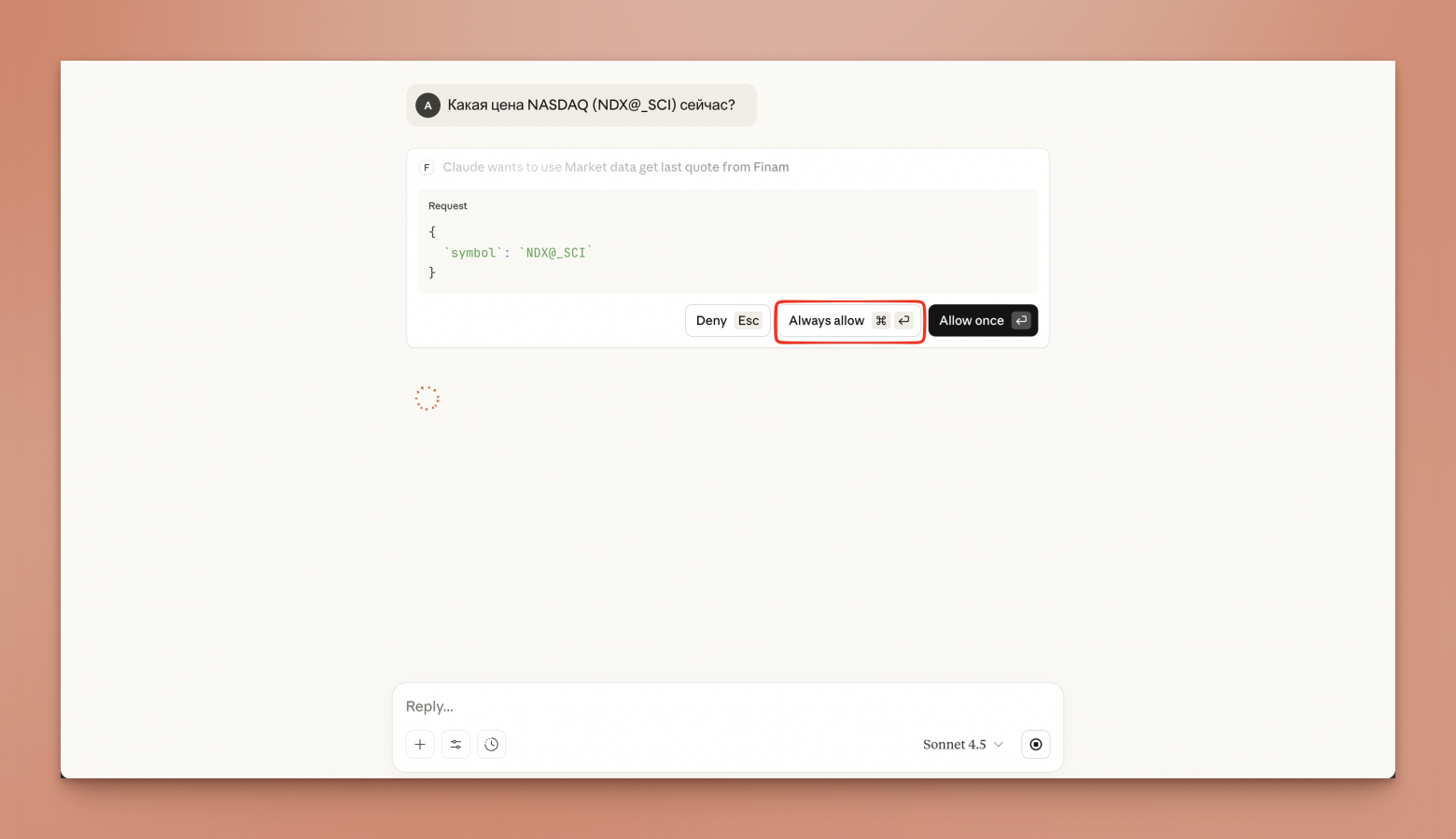 Готово! Далее при запросах разрешите Claude использовать инструменты Finam.
