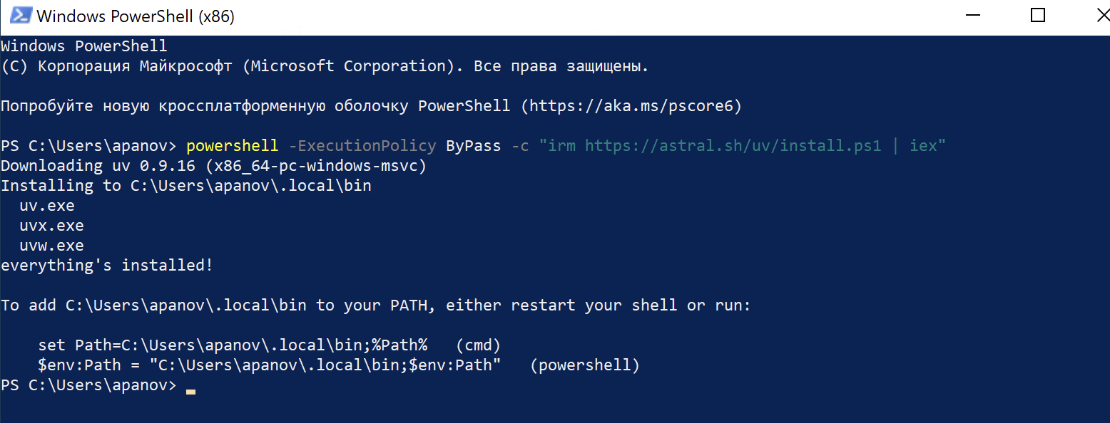 powershell -ExecutionPolicy ByPass -c "irm <https://astral.sh/uv/install.ps1> | iex"