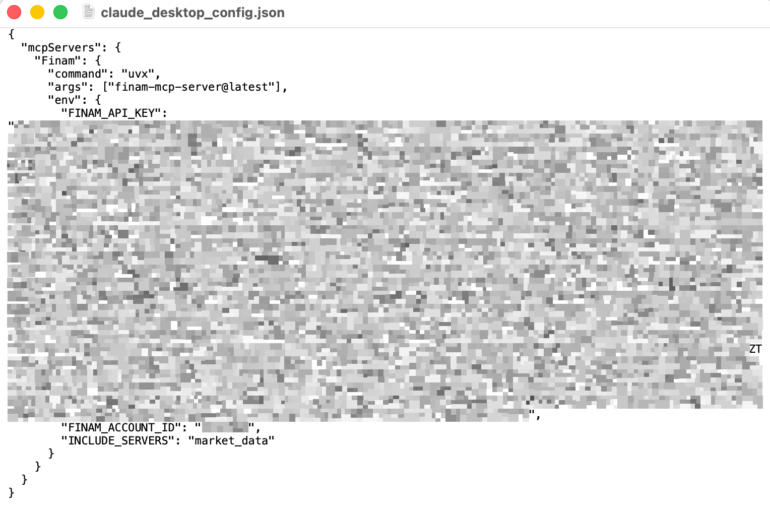 Важно: Замените ваш_api_ключ и ваш_номер_счета на ваш полученный токен и номер счета из личного кабинета Finam. Содержимое файла должно быть таким