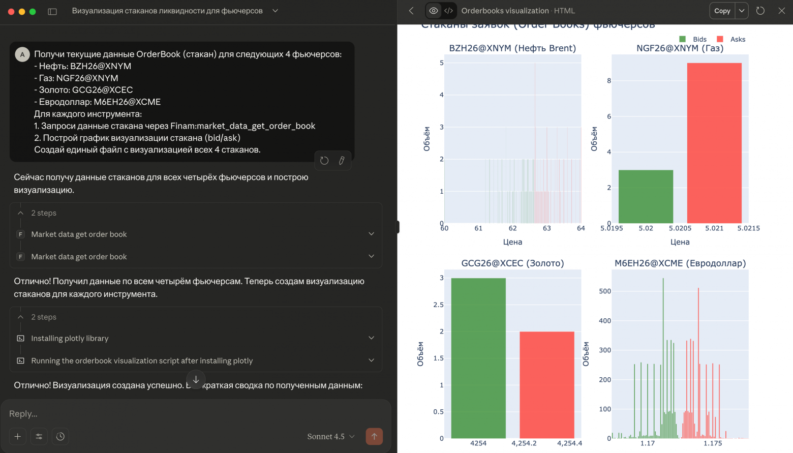 Поэтому мы сделали Finam MCP-сервер на базе Trade API. С его помощью популярные ИИ (ChatGPT, Claude, Gemini) могут во время разговора получать реальные данные по рынку ценных бумаг и использовать их для анализа, визуализации и выработки полезных инсайтов.