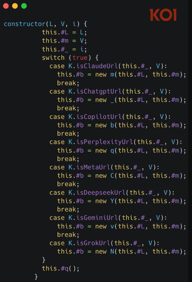 Изучение базового кода расширений показало, что каждое из них содержит восемь так называемых «исполнительных» скриптов для ChatGPT, Claude, Gemini и пяти других ведущих платформ ИИ. Скрипты внедряются в веб-страницы всякий раз, когда пользователь посещает одну из этих платформ. Затем они переопределяют встроенные функции браузера для выполнения сетевых запросов и получения ответов.