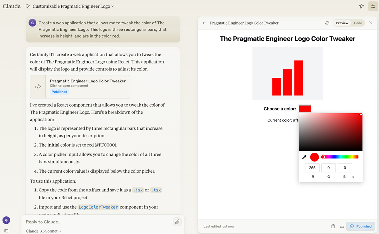 #1 — Anthropic Claude (Artifacts): Эталонный пример «одноразового софта» (disposable software). Раньше, попросив код игры «Змейка» или финансовый график, вы получали текст, который нужно было копировать в IDE. Теперь Claude мгновенно рендерит рабочий интерактивный интерфейс прямо в окне чата. Пользователь получает микроприложение ровно на те 5 минут, что оно ему нужно, без установки и деплоя.