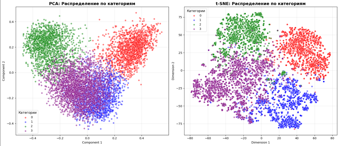 Визуализируем кластеры, используя алгоритмы PCA и t‑SNE, используя эмбеддинги и известные метки классов