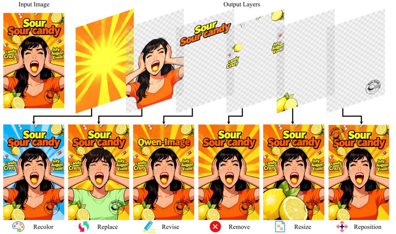 Alibaba выпустили реальный ИИ-фотошоп Qwen-Image-Layered. Модель генерирует картинку, и в процессе сама разделяет её на прозрачные RGBA-слои: фон, объекты, текст.как в Photoshop.