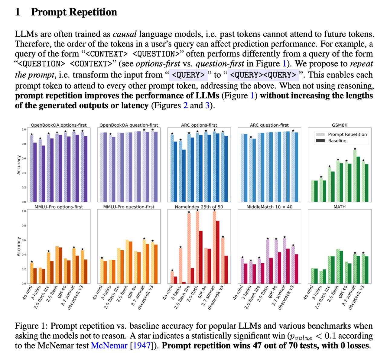 Исследователи из Google выяснили, что повторение запроса заметно повышает качество ответов у нераcсуждающих LLM. Если вместо обычного <Запрос> отправлять <Запрос><Запрос>, результаты в ряде тестов улучшаются до ~10%, а в 67% случаев эффект статистически значим. Иногда ещё лучше работает тройное повторение или формулировка вроде «Давай я повторю:».