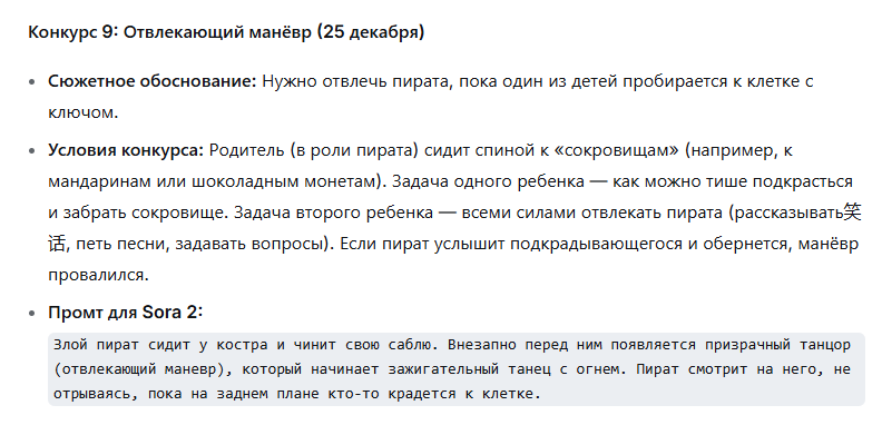 Я планирую изначально 6-8 активностей (по одной в день), поэтому на каждую активность надо сделать собственный ролик. Промты выше как раз для этого и нужны были. Часть промтов использовал, часть переделывал по ходу. Примеры видео по ссылке.