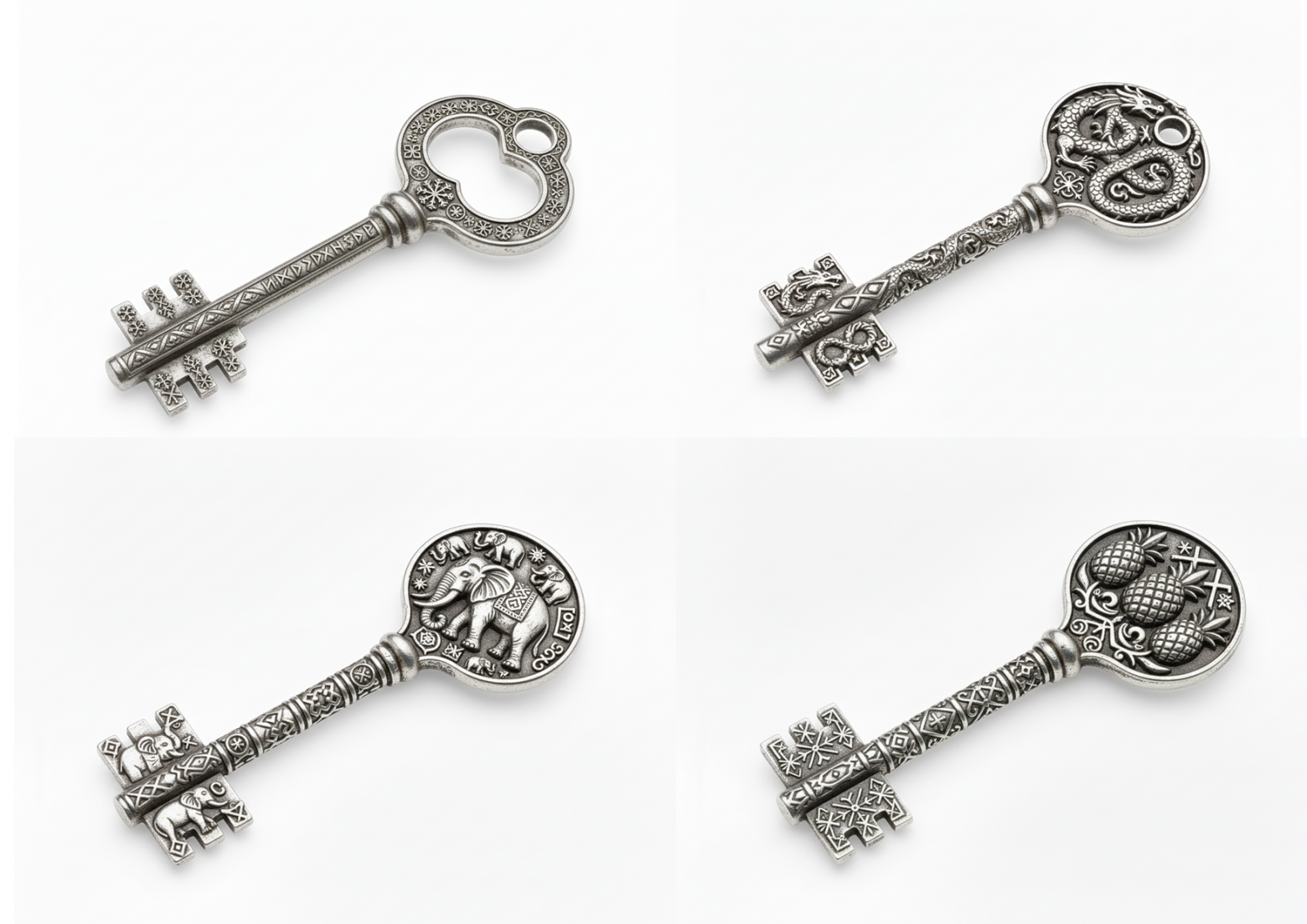 после были уточнения: пусть будет вид сверху на ключ, добавь в его узоры снежинок, сделай такой же ключ но с драконами