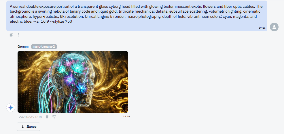 Решили проверить графические возможности BotНub, смешав в одном запросе прозрачное стекло, неоновую органику и сложный фон из жидкого золота с бинарным кодом. Результат перед вами: модель идеально отработала физику света и текстуры, сохранив четкость даже в мелких деталях шестеренок и лепестков, не превратив композицию в кашу.