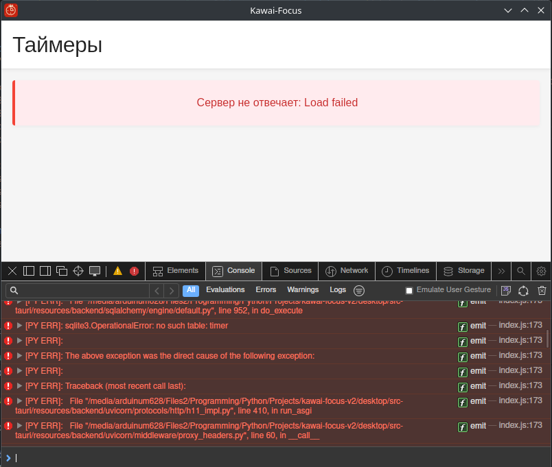 Режим разработчика удобен тем, что позволяет запускать консоль разработчика, похожую на консоль браузера: анализировать ошибки, смотреть HTML и многое другое. В данном случае консоль показала, что приложение не может найти таблицу taimer в базе данных.