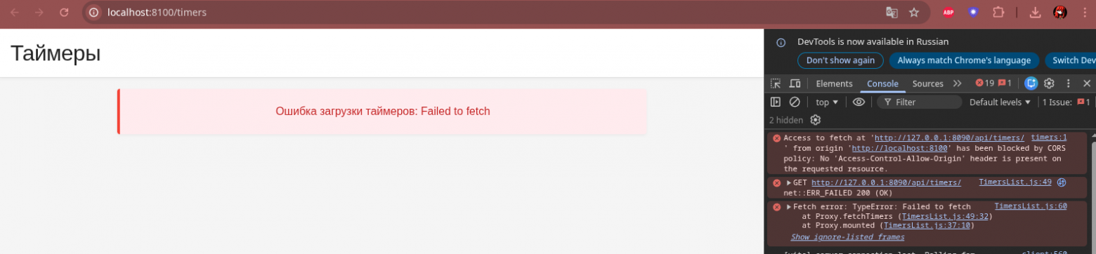 Если в консоли браузера появляется ошибка, связанная с CORS, и данные не отображаются, это означает, что необходимо разрешить CORS на бекенде.