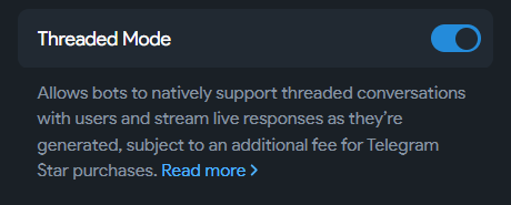 Ах да, кое-что скрыто в большинстве анонсов, но видно в девелопер апдейтах и @BotFather: при включении на боте Тем\Тредов, все платежи в тг-звездах через бота будут облагаться 15% комиссией.