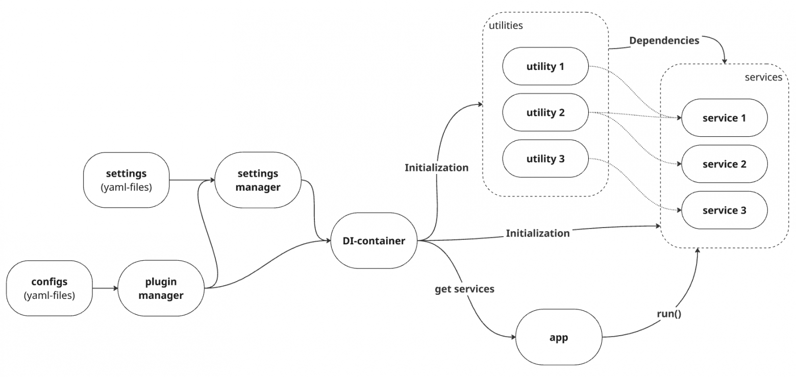Изначально концепт был предельно прост — создать универсальное ядро для ботов, чтобы можно было собирать ботов разной сложности легко и быстро, без необходимости каждый раз писать код с нуля. В качестве основы для конфигурации и создания сценариев были выбраны YAML-файлы: удобный формат, понятная структура, достаточно легко читается и редактируется даже без IDE.