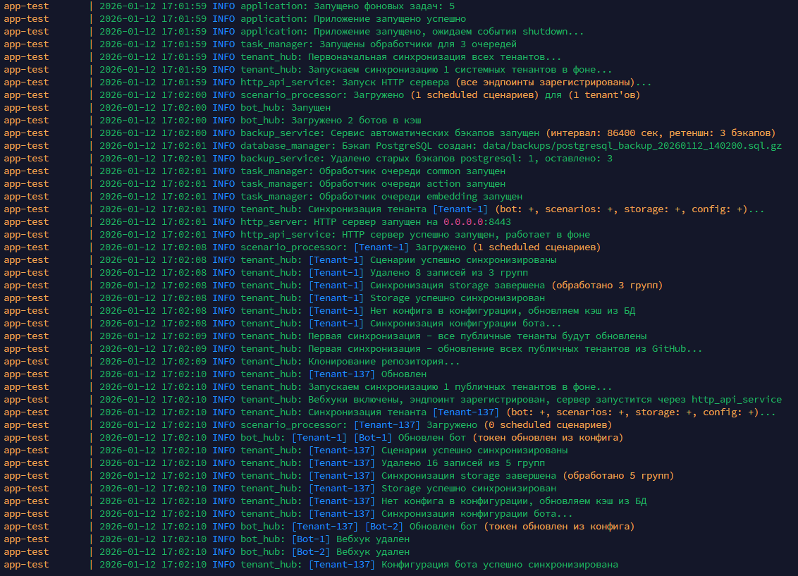 Tenant изоляция — каждый клиент (тенант) имеет собственную конфигурацию: токен бота, набор сценариев, Storage. Данные разных тенантов полностью изолированы на уровне базы данных.