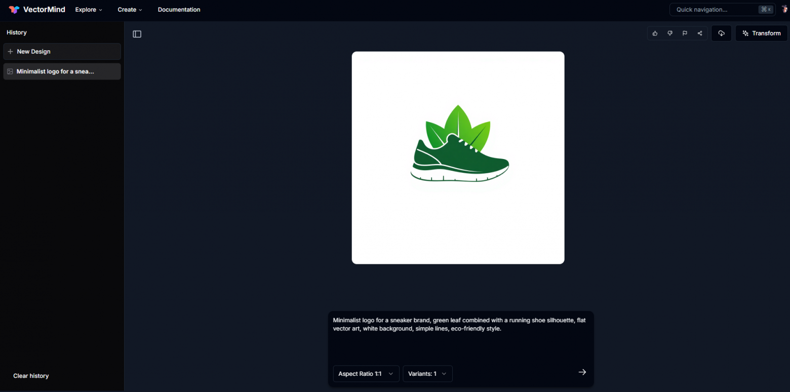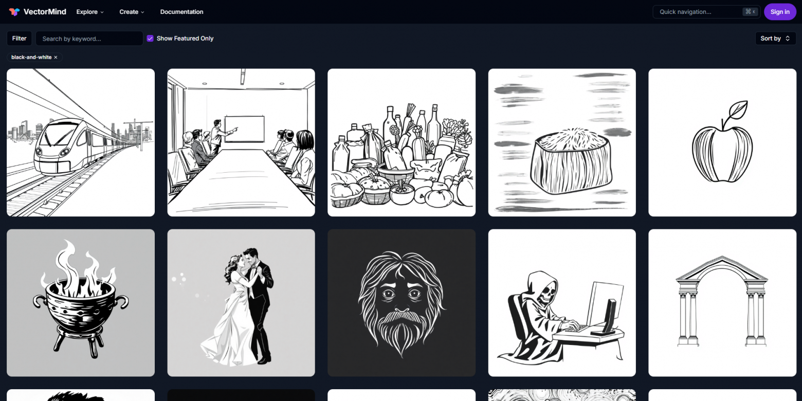 Главная проблема большинства нейросетей - страх чистого листа. Вы сидите перед мигающим курсором и не знаете, как объяснить машине, что хотите минималистичный лого в стиле киберпанк, но чтобы не перегружено. В VectorMind вы просто идете в раздел Explore (в левом верхнем углу), выбираете категорию (например, Logos или Lettering) и листаете ленту шедевров. При регистрации начисляется 30 кредитов, стоимость одной генерации - 1 кредит.
