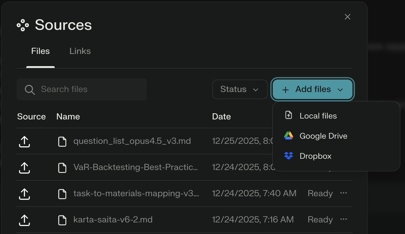 Internal Knowledge — ваши файлы и коннекторы (Google Drive, Dropbox, GitHub, Notion, Confluence, Jira, Asana, Linear и др.).