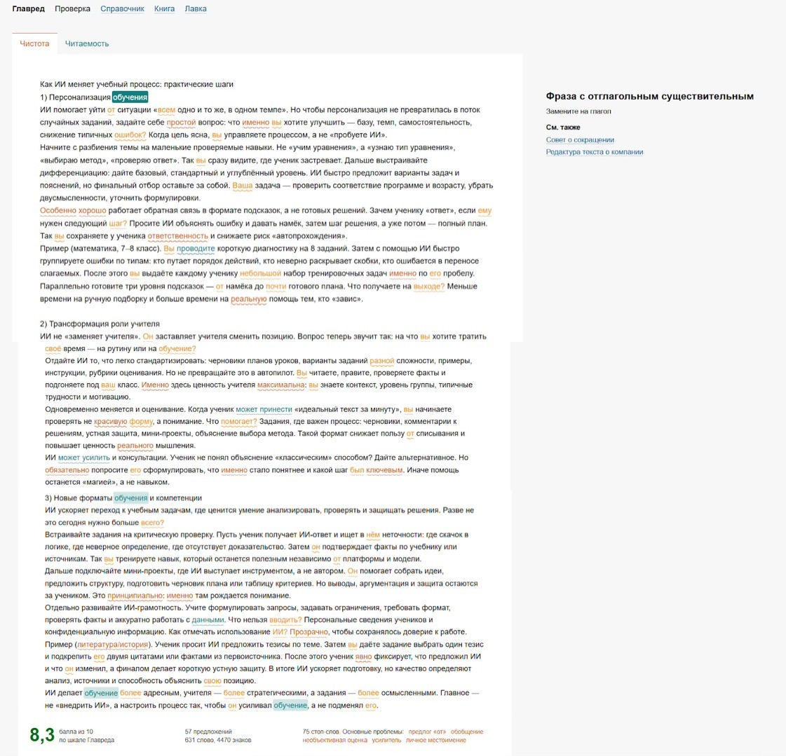 Но никогда не полагайтесь только на ИИ-корректуру. После всех правок прочитайте текст вслух. Это лучший способ поймать неуклюжие фразы и ритмические сбои.