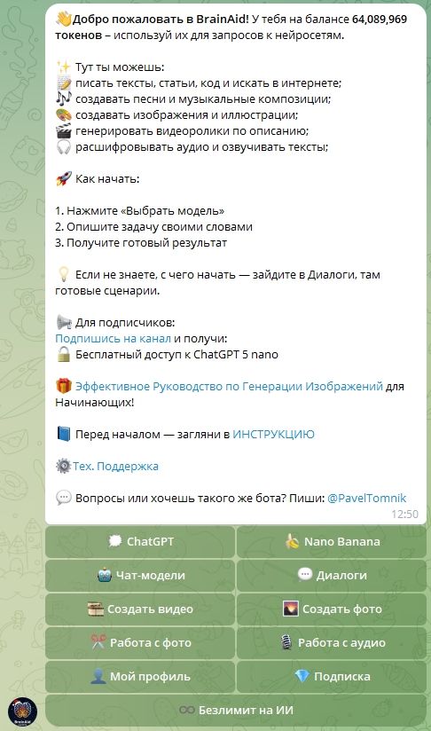 Работать с ботом удобно как опытным пользователям, так и новичкам благодаря интуитивно понятн��му интерфейсу и грамотно построенному меню. При подписке на бота вы получите бесплатную подписку на модель ChatGPT 5 nano. Кроме этого, при подписке на канал разработчика можно пользоваться безлимитным доступом к моделям – gpt-4o-mini и