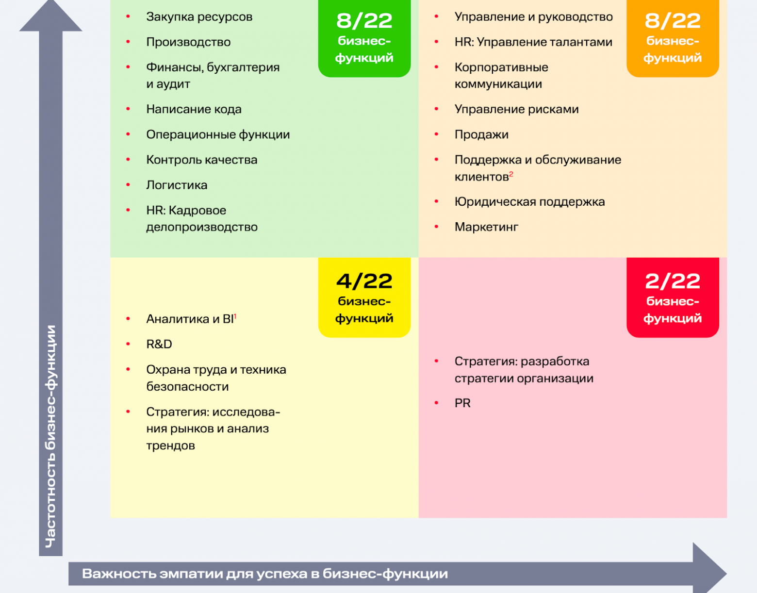 Низок — у разработки стратегии, PR-функций, управления талантами, корпоративной коммуникации, поддержки и маркетинга. ИИ автоматизировал клиентскую поддержку, но в перспективе у него выиграет коммуникация с реальными сотрудниками, где важнее всего эмпатия и эмоциональный интеллект.
