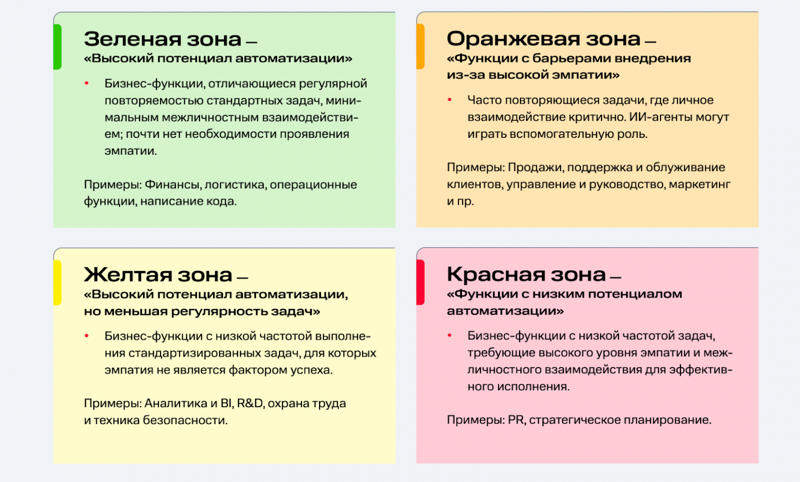 Согласно исследованию, ИИ-агенты перспективны в операционно-ориентированных функциях, где критичны стандартизация и масштаб. Чего у роботов нет, так это эмпатии. Поэтому высок потенциал внедрения у задач вроде закупок, финансовой отчетности, аудита, кода, логистики и операционки.