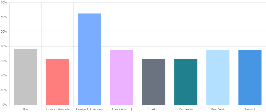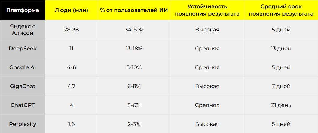 Скорость появления результата говорит о комплексно о том, насколько быстро, в среднем, ИИ реагирует на появление новых публикаций и как быстро они начнут использоваться для формирования ответа. Заметили, например, что ChatGPT и DeepSeek могут дольше не выдавать информацию по бренду, несмотря даже на наличие одного или двух сайтов с информацией в доверенных источниках. А Яндексу, порой, достаточно одного дня.