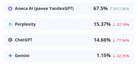 Далее расположились ChatGPT с долей рынка в РФ 5-6% и Perplexity 2-3%. Честно говоря, ожидал от этих двоих большего. ChatGPT все таки мировой лидер, а Perplexity использую как классный поисковик, который работает в РФ без ограничений.