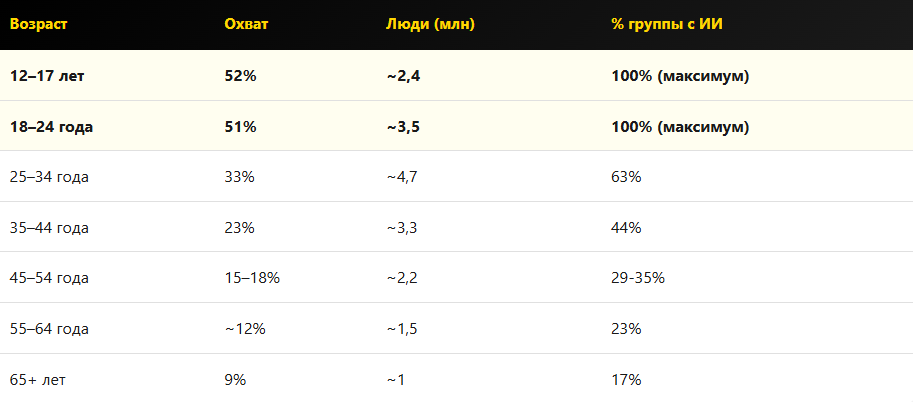 Основное ядро активных ИИ пользователей занимает молодое поколение возрастом от 12 до 34 лет.