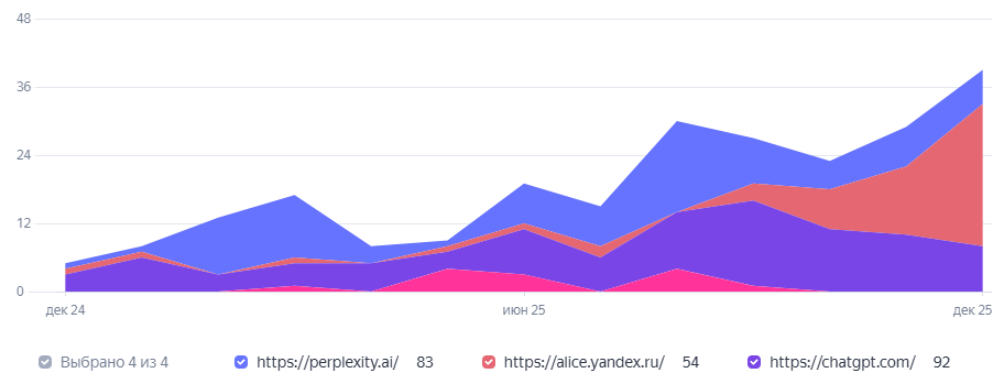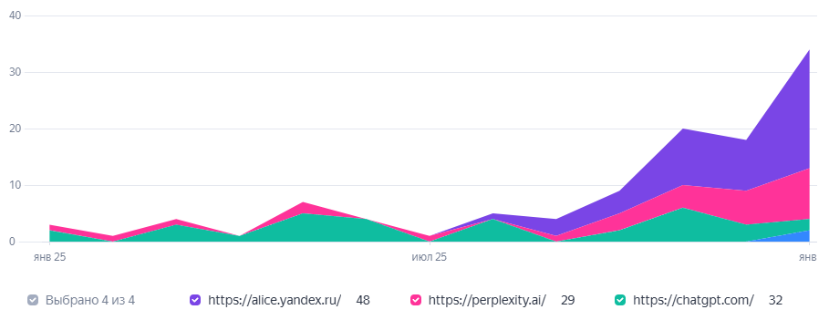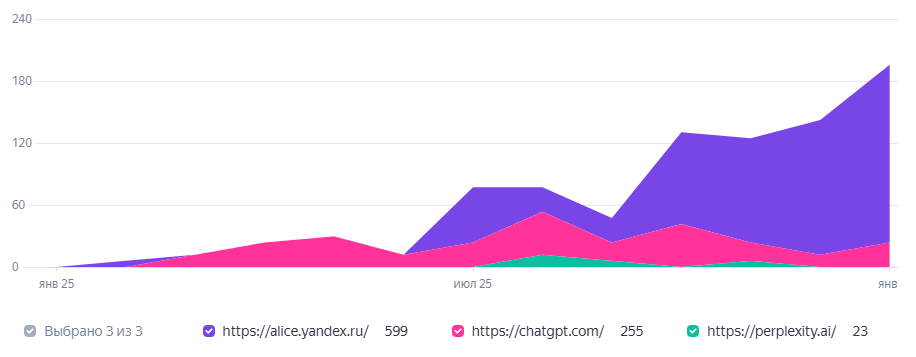 Безоговорочная победа Алисы, причем резкий рост приходится именно на конец года, когда мы запустили активное продвижение в ответах нейросетей. Однако наши действия влияли на видимость во всех ИИ равномерно, вот пример одного из проектов: