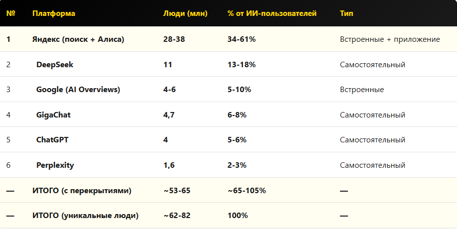 Собрали данные опросов ВЦИОМа, исследования Mediascope и Microsoft AI Economy в Октябре-Ноябре 2025 – проблема была в том, что они учитывали не все, в частности не учитывали встроенные в поиск ИИ поисковых систем + сами по себе были разрозненные и часто декларировали похожие цели, но по факту собирали разные данные.